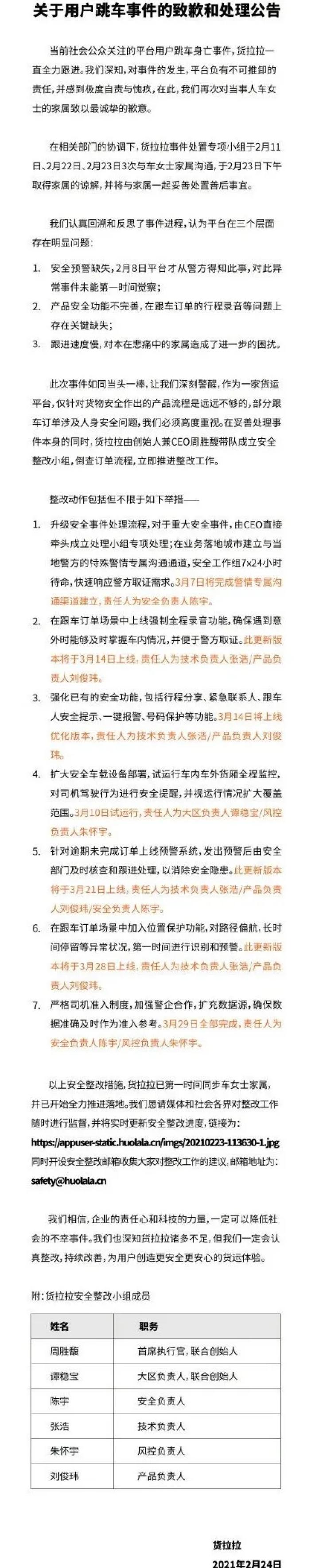 2月24日,货拉拉公司就女孩跳车身亡事件致歉,并出台了整改意见目前,案件正在进一步侦查中。