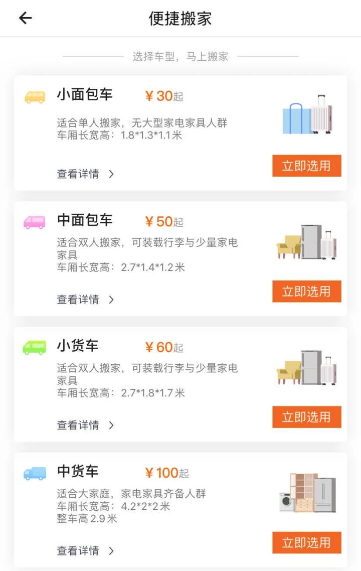 “打开APP,首页就有搬家这个选项,点进去之后,有一个预约页面,上写着:叫车价30元起,上面还有一排小字:叫车上门,即装即走,经济实惠的搬家的方式。”