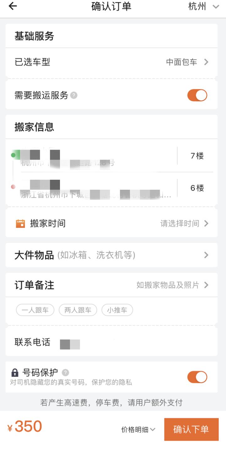 “因为我住的是老小区,没有电梯,为了省力,点了搬运服务。搬运服务的价格和楼层有关,我要从老小区的7层,搬到新小区的6层,这时,页面显示费用是350元。”小陈说,根据页面来看,这个搬运费和是否有电梯以及层高有关。