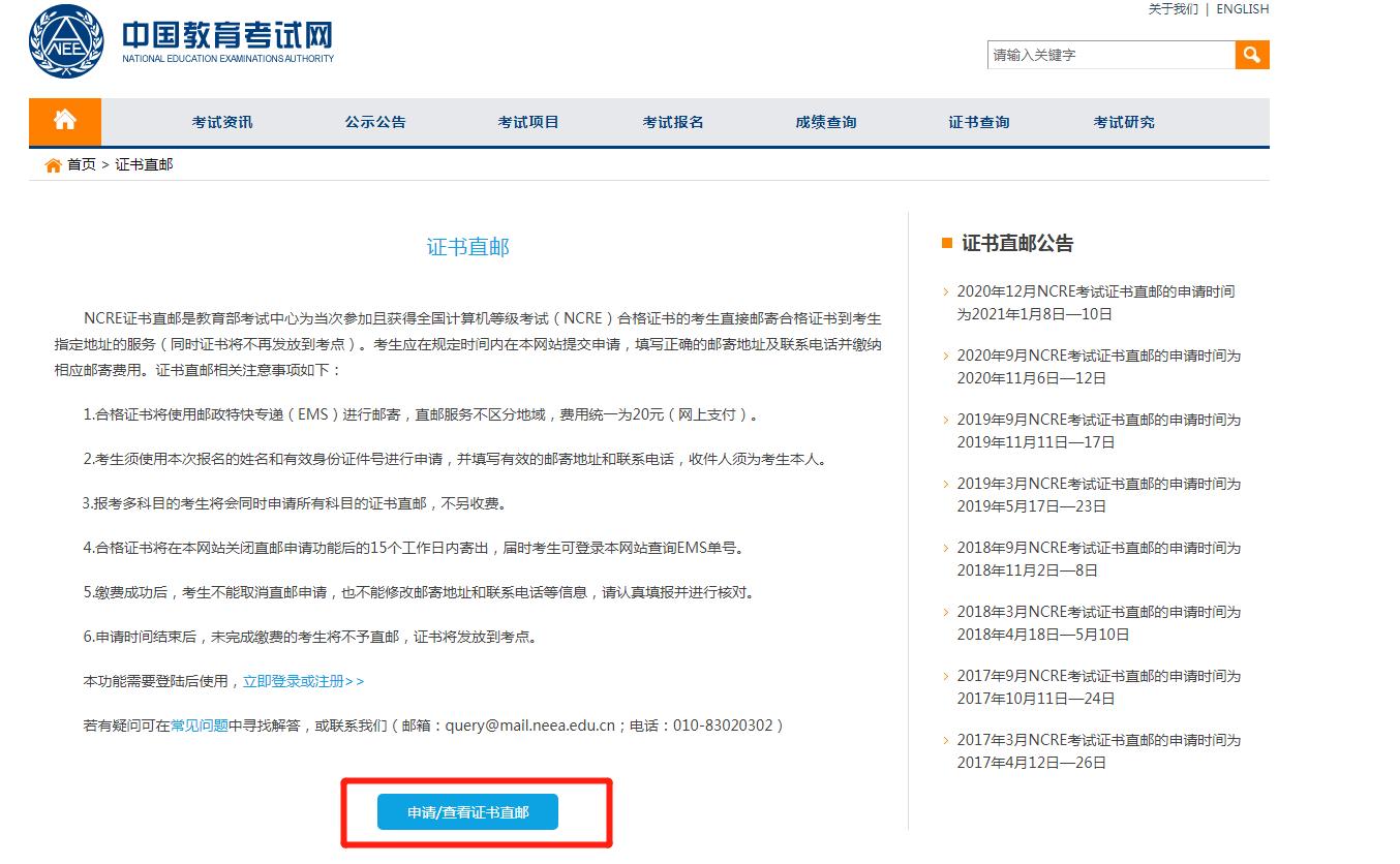 1.合格证书将使用邮政特快专递(EMS)进行邮寄,直邮服务不区分地域,费用统一为20元(网上支付)。