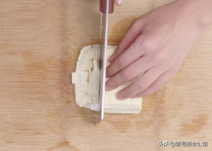 第一步:首先我们把准备好的嫩豆腐适当切成1.5cm见方的小块。
