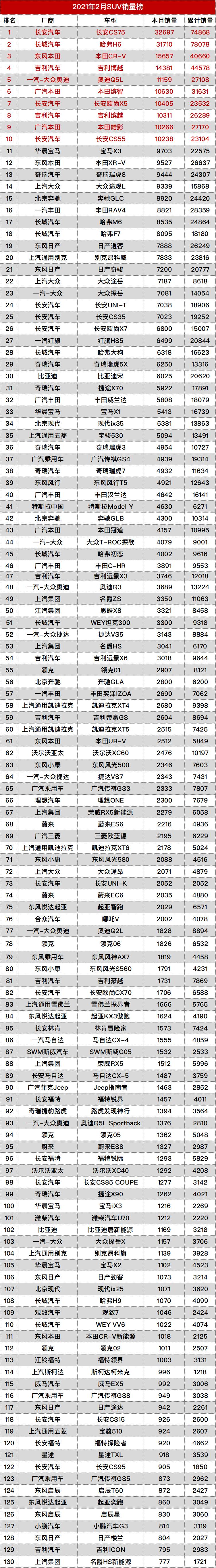2021年2月SUV销量总榜最大的看点是长安CS75以32697辆超过了哈弗H6,以31710辆的成绩夺得SUV销量月度冠军,终结了哈弗H6那93冠的纪录。东风本田CR-V、吉利博越、奥迪A5L分别以15657辆、14381辆、11159辆排第三、四、五名。此外,长安欧尚X5、吉利缤越、长安CS55分别以10405辆、10311辆、10238辆排第7、8、10名。