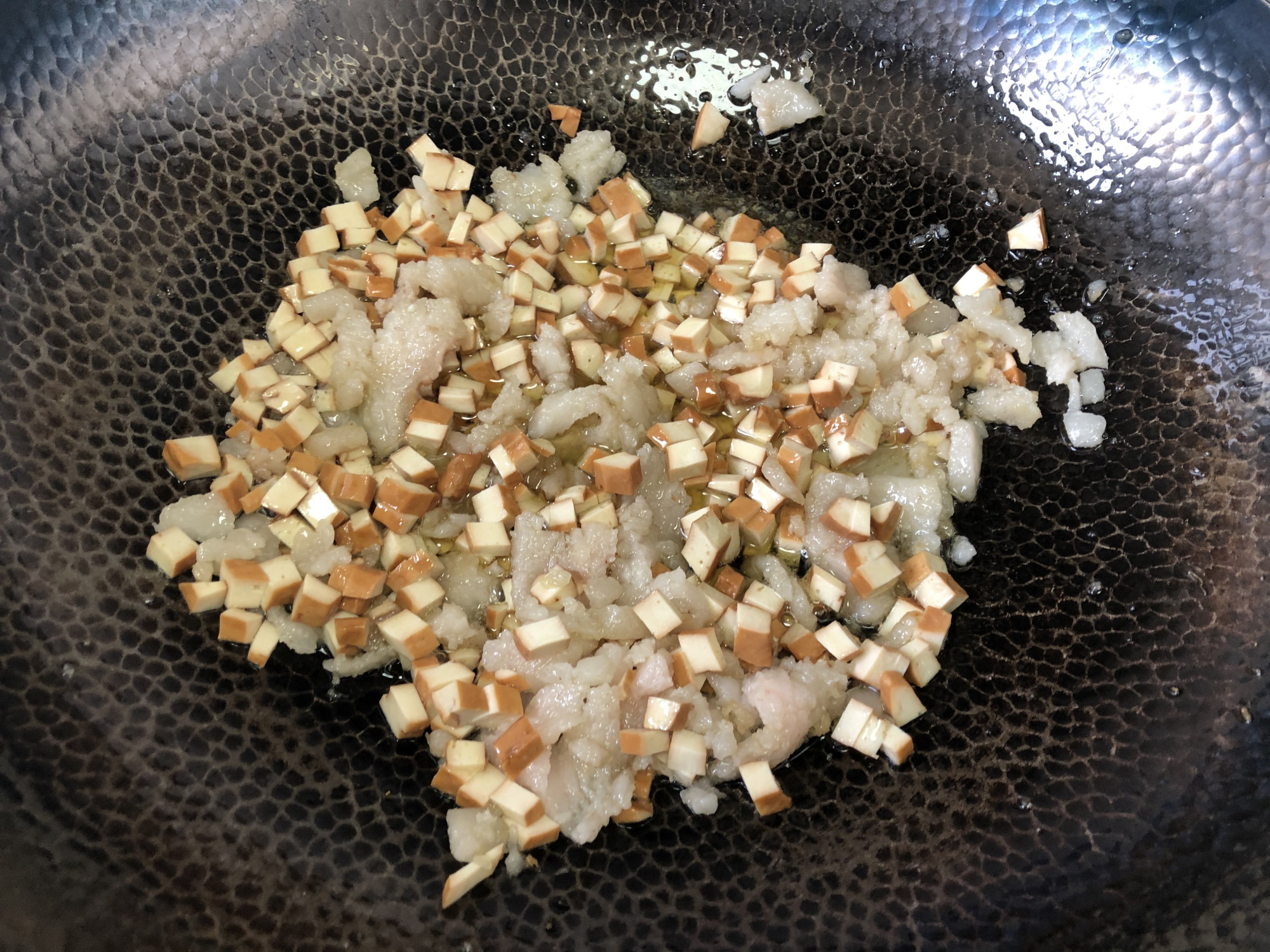 5、锅中下入少许底油,下入肥肉丁、香干丁,小火煸炒,炒出肥肉油脂的同时把香干炒香。