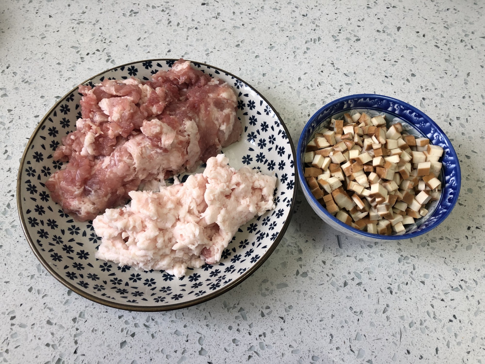 1、吃前两年建议大家选择前腿肉,肥肉相间有嚼劲,做成肉丁非常好吃。猪前腿肉去皮,然后肥瘦分开,剁成肉丁。然后准备3块香干,切成小丁。