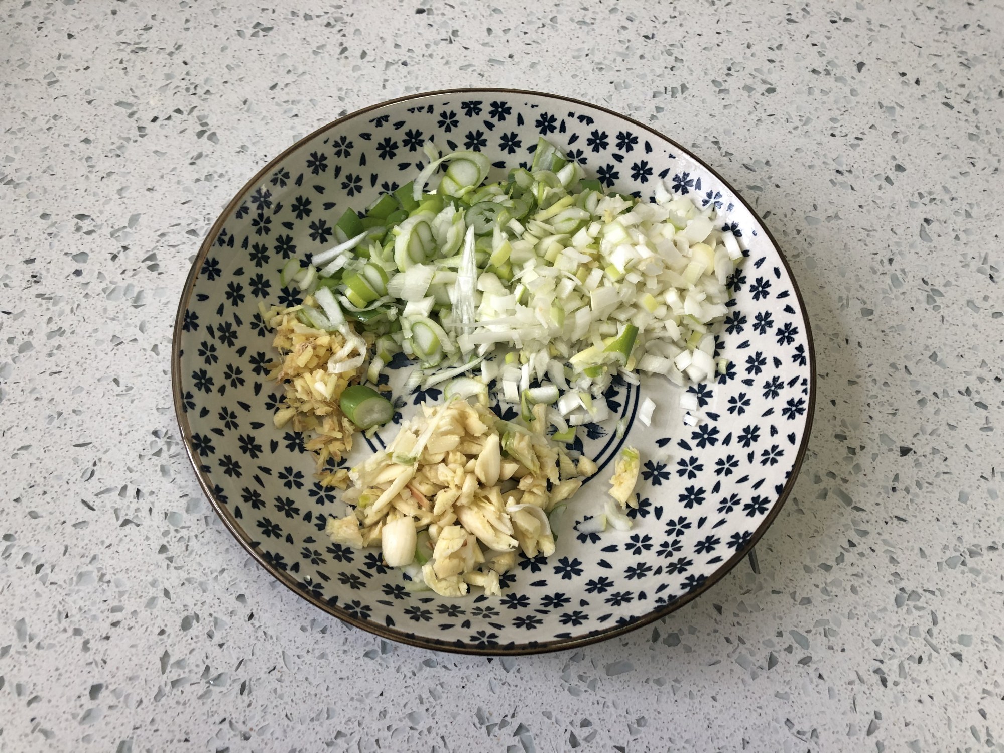 2、准备一些调味食材,常见的葱姜蒜,切成碎末备用。