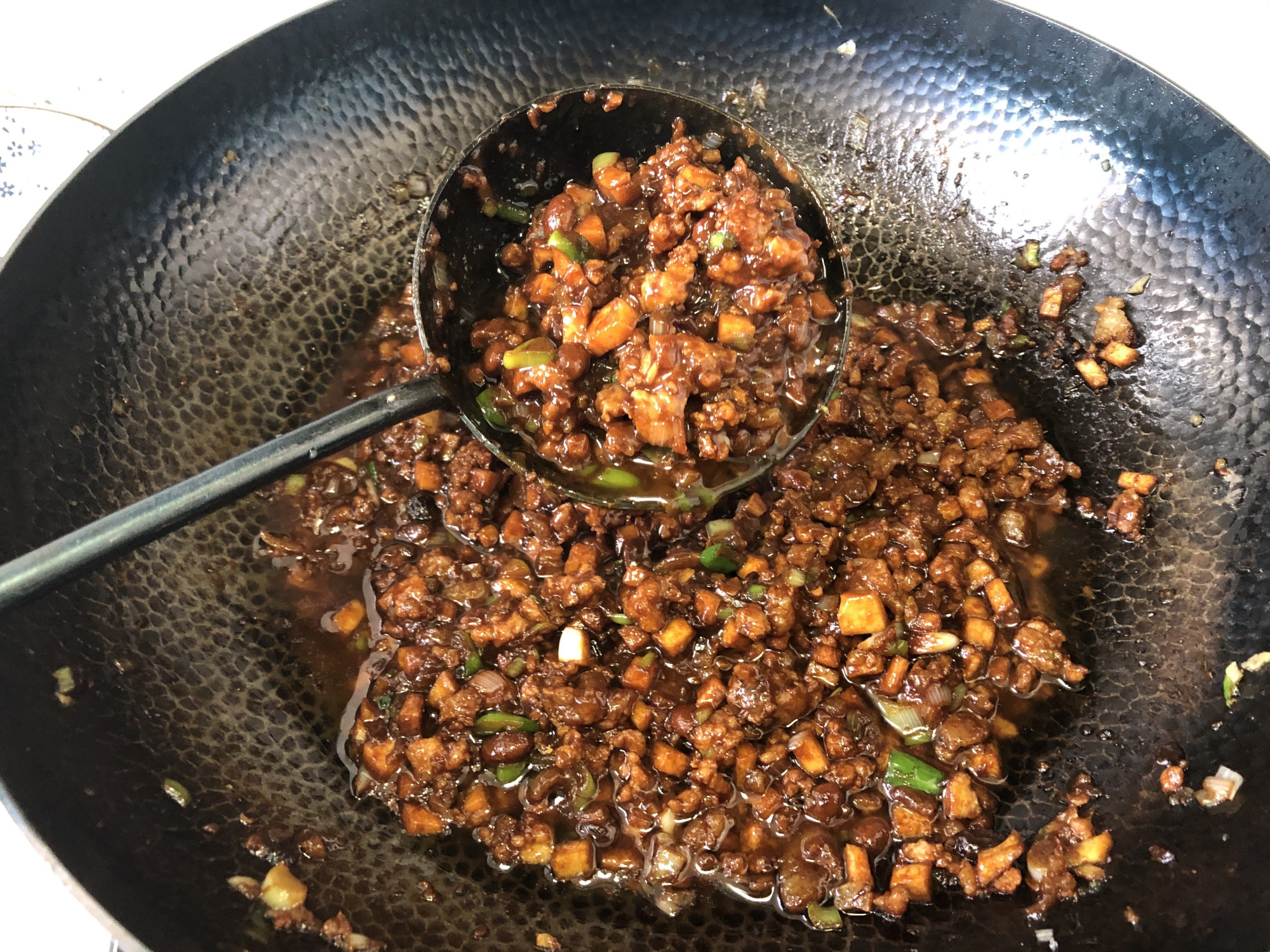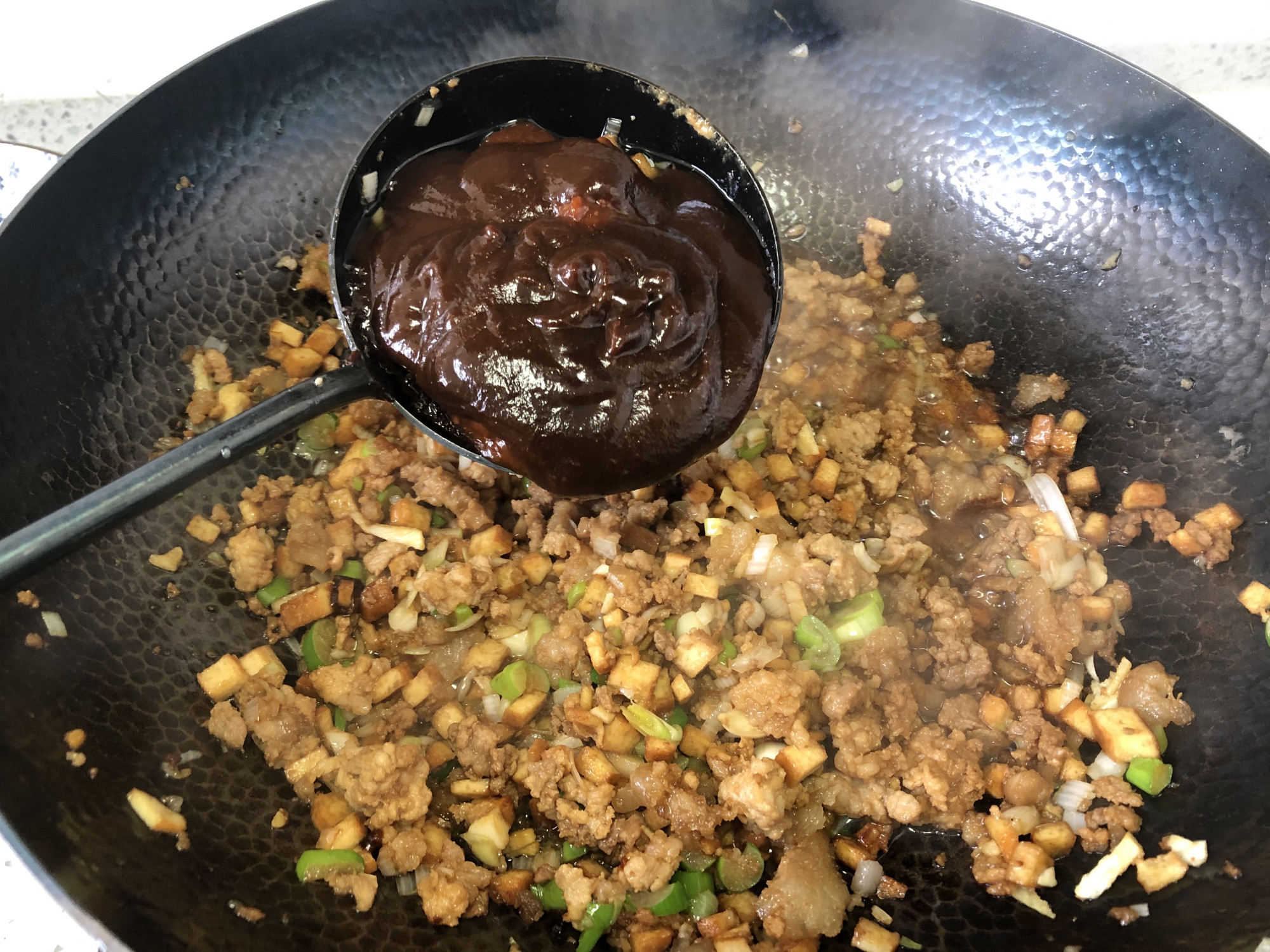 6、加入瘦肉丁、葱姜蒜,炒至瘦肉变色,然后加入生抽、老抽调味儿,按照比例加入酱料,小火慢慢熬制大约10分钟时间,熬的越久酱越香!