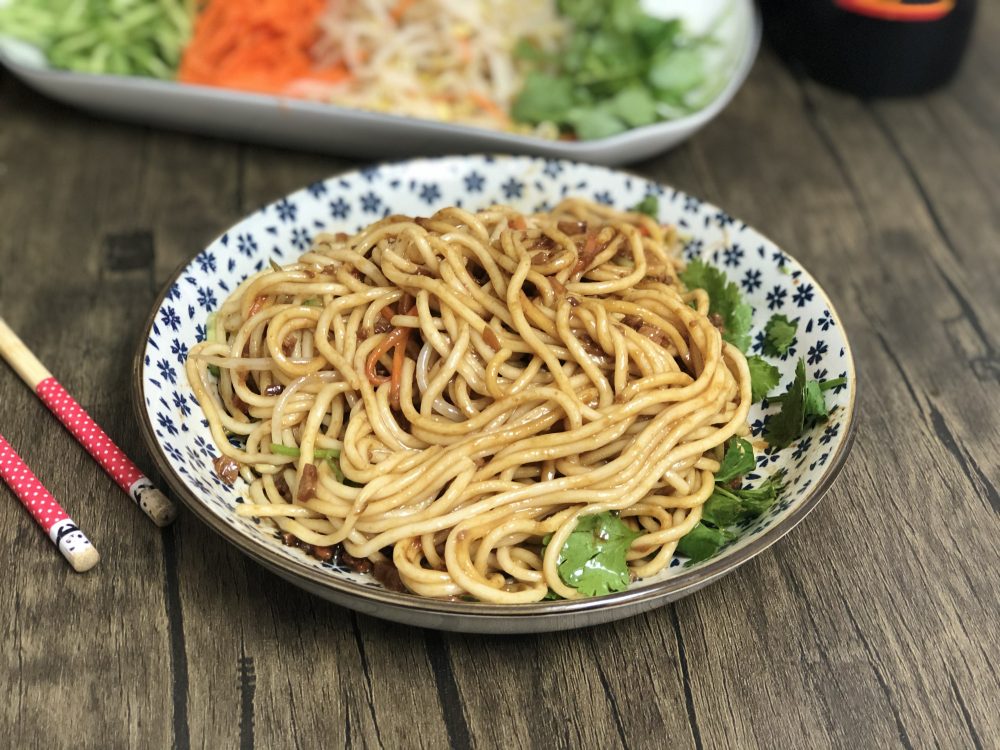 9、面条煮好之后,加入2勺炸酱、放上所有的配菜,搅拌均匀,香喷喷的炸酱面就可以开吃了!色香味俱全,吃完还想吃!