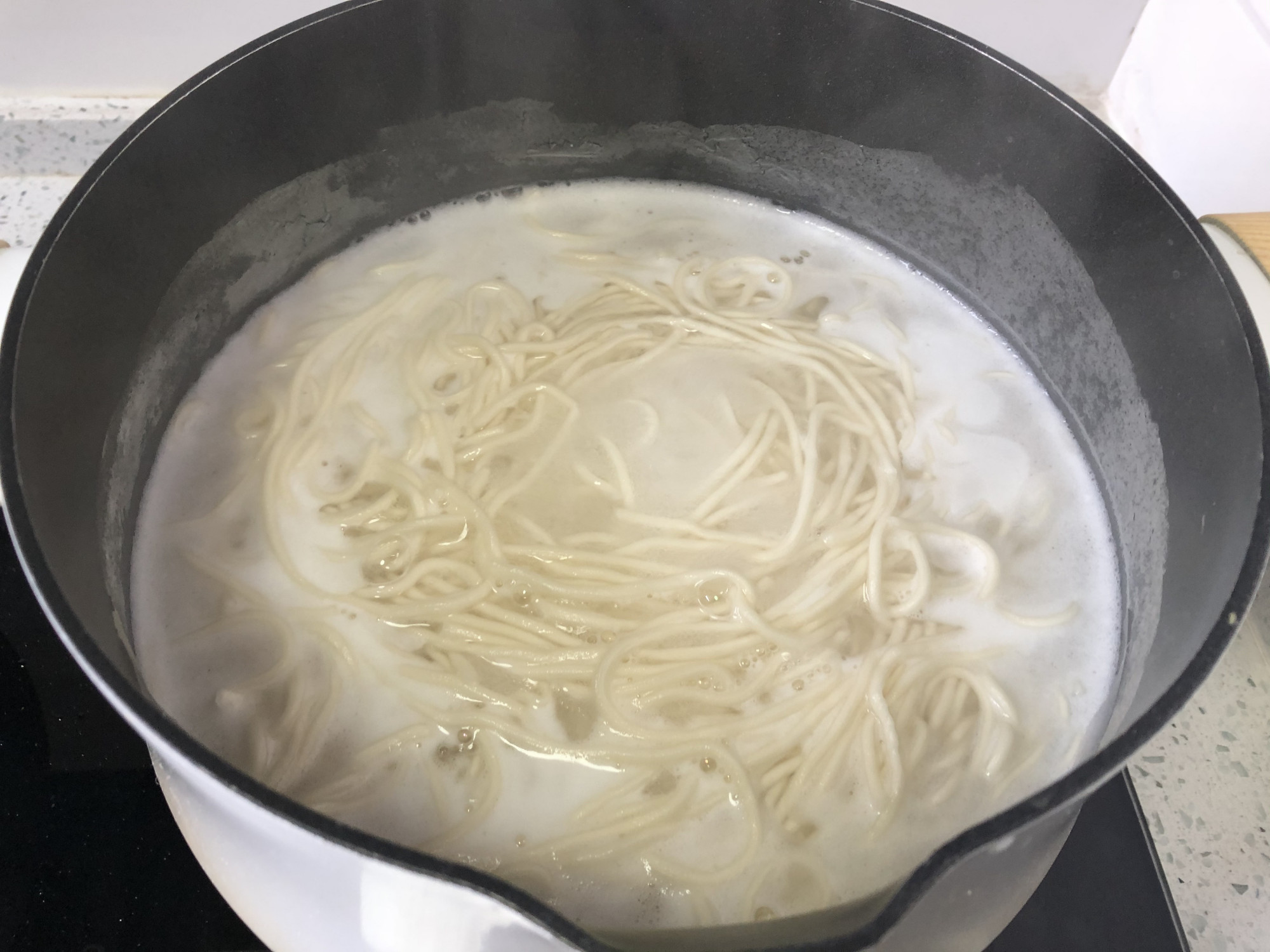 8、吃炸酱面的时候,选面条也是有讲究的,我们最好选择新鲜的圆面条,这样的面条煮出来更筋道好吃!煮面的途中加入2-3次凉水,面条更加爽滑!