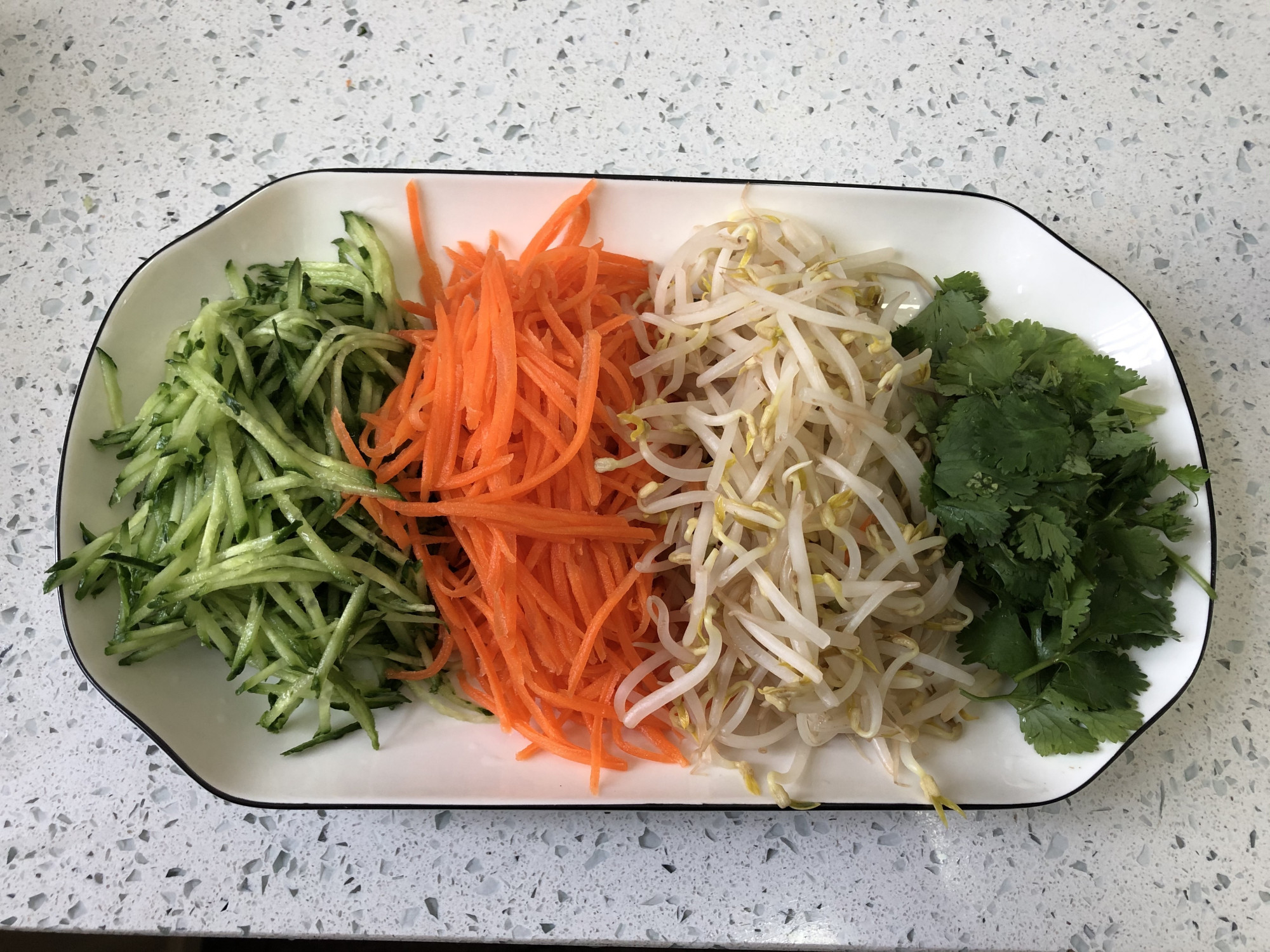 食材:猪前腿肉500克、绿豆芽100克、胡萝卜200克、黄瓜200克、香干3片、大葱1棵、大蒜半头、生姜2片、香菜少许