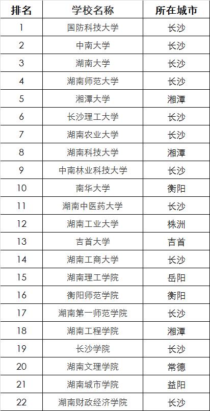 2020年高考前夕,湖南省出了一个好消息。有5所大学调入本科一批录取,分别是:长沙学院、湖南文理学院、湖南工程学院、湖南城市学院和湖南财政经济学院。至此,湖南一本院校数量增至22所。这22所一本大学排名如下: