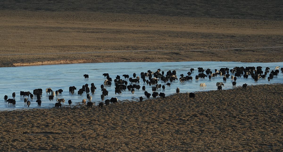 草狐过路,牦牛过河,独狼踏冰,秃鹫分羊,野驴成群,远处还有奔跑的“白屁股”藏原羚……当曲上游的宽缓河谷,不仅是野生动物的天堂,如今也是西藏和青海几个乡的牧民聚集区,乡村建设发展迅速。