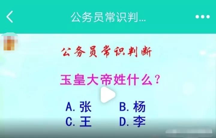 图中是道公务员考试判断题,问玉皇大帝姓什么?有张、杨、王、李四姓可供选择。