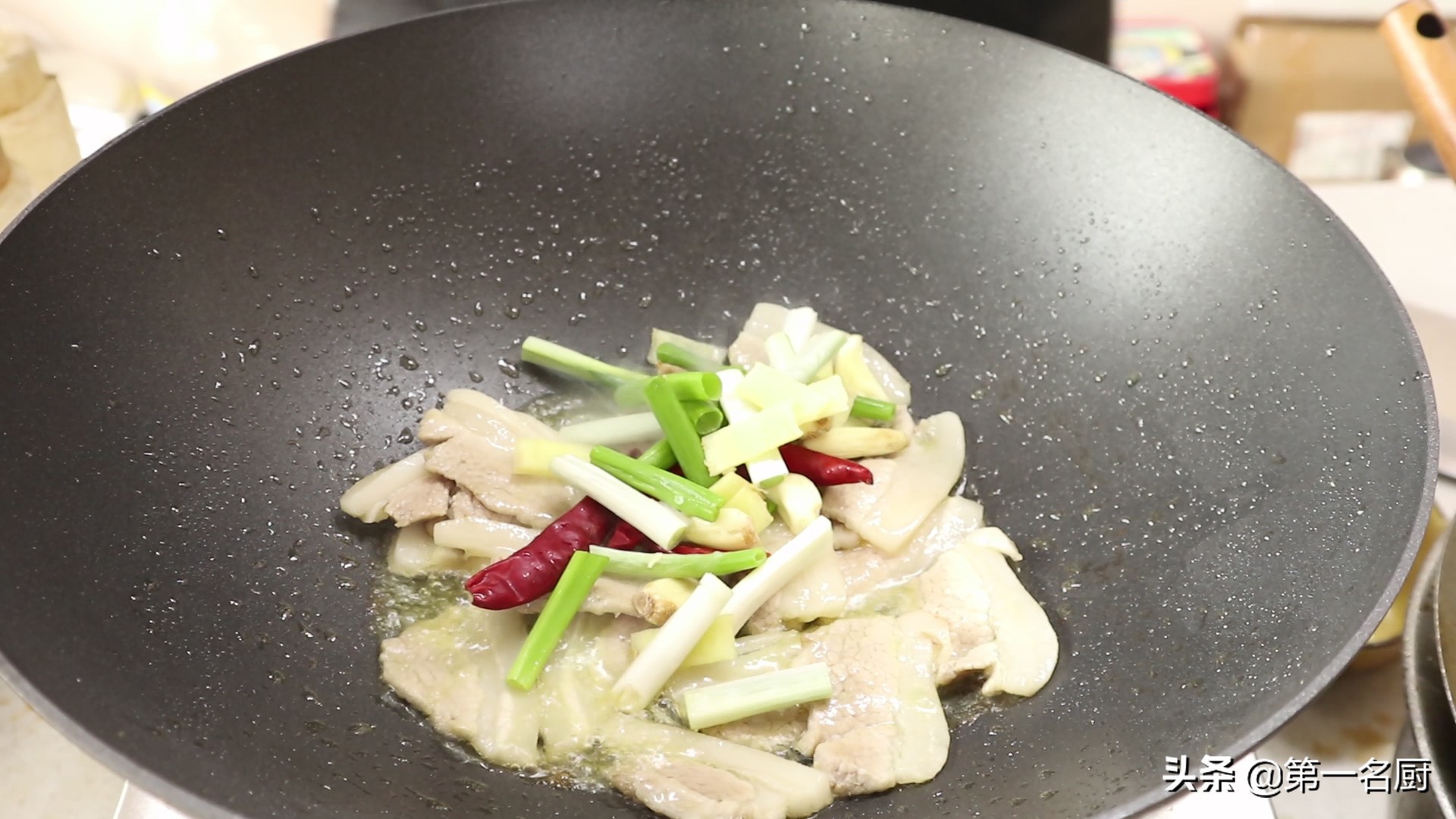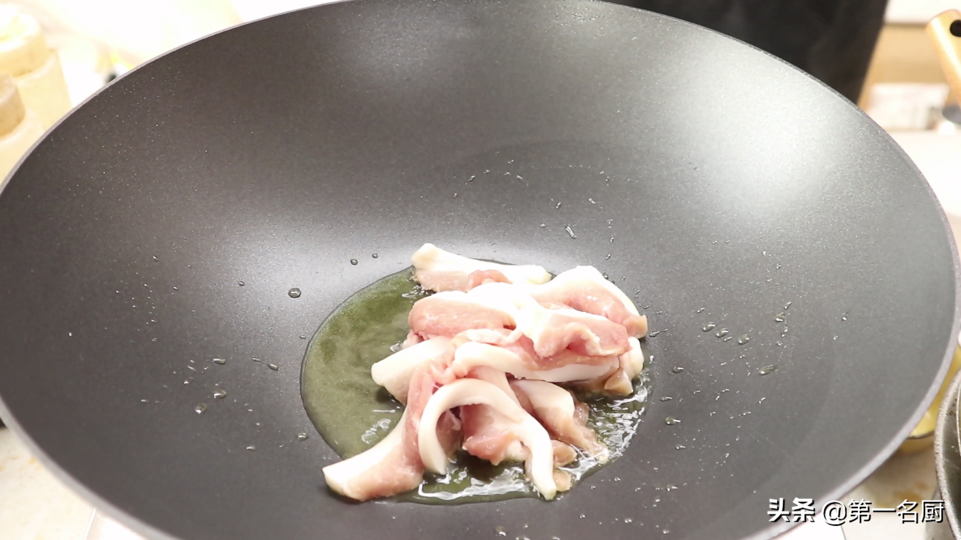 10.重新起锅,添入少许食用油,油热以后,下入五花肉,快速翻炒,把五花肉炒至变色。
