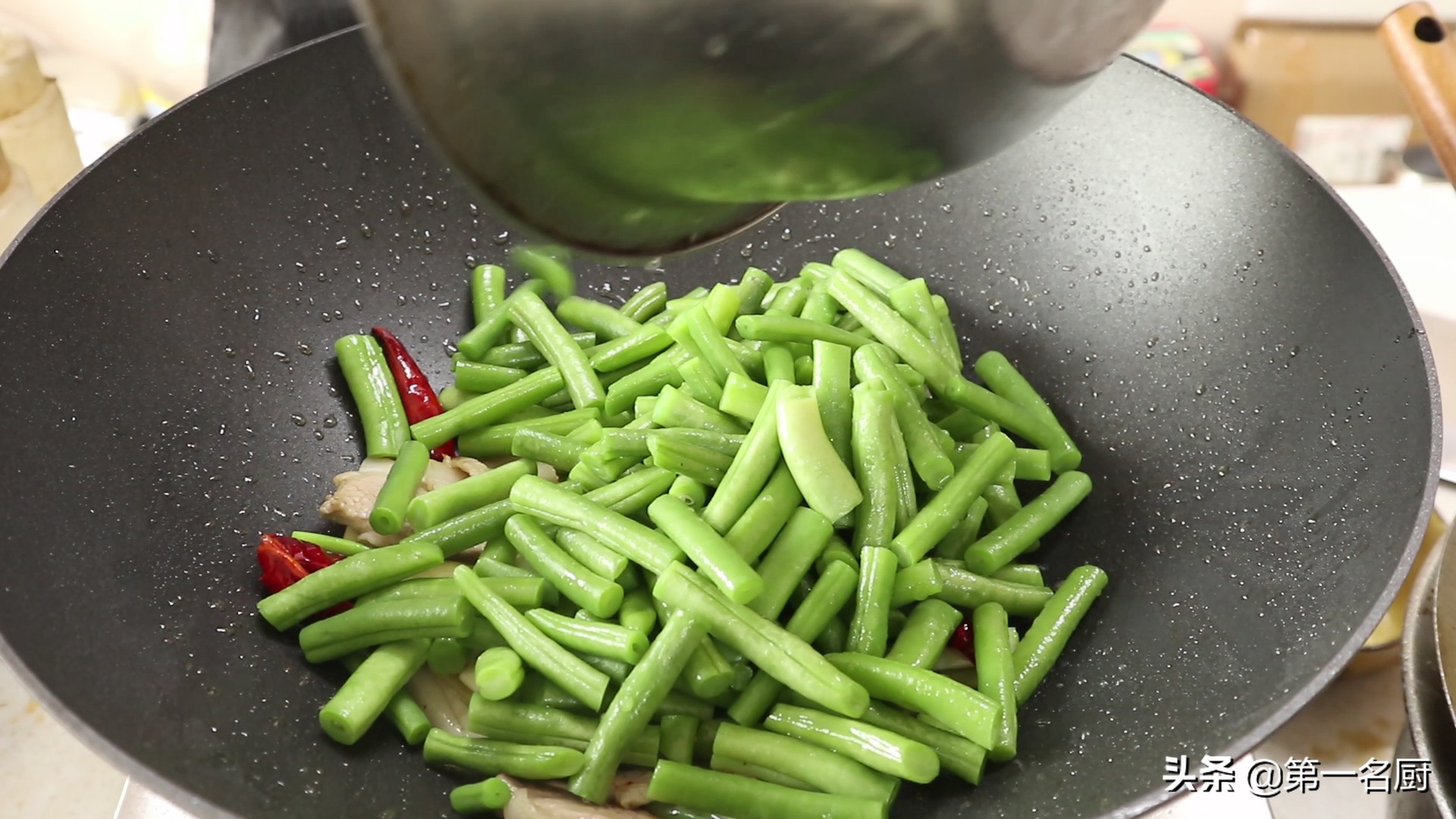 12.炒香以后,倒入四季豆,快速翻炒几下,然后开始调味。