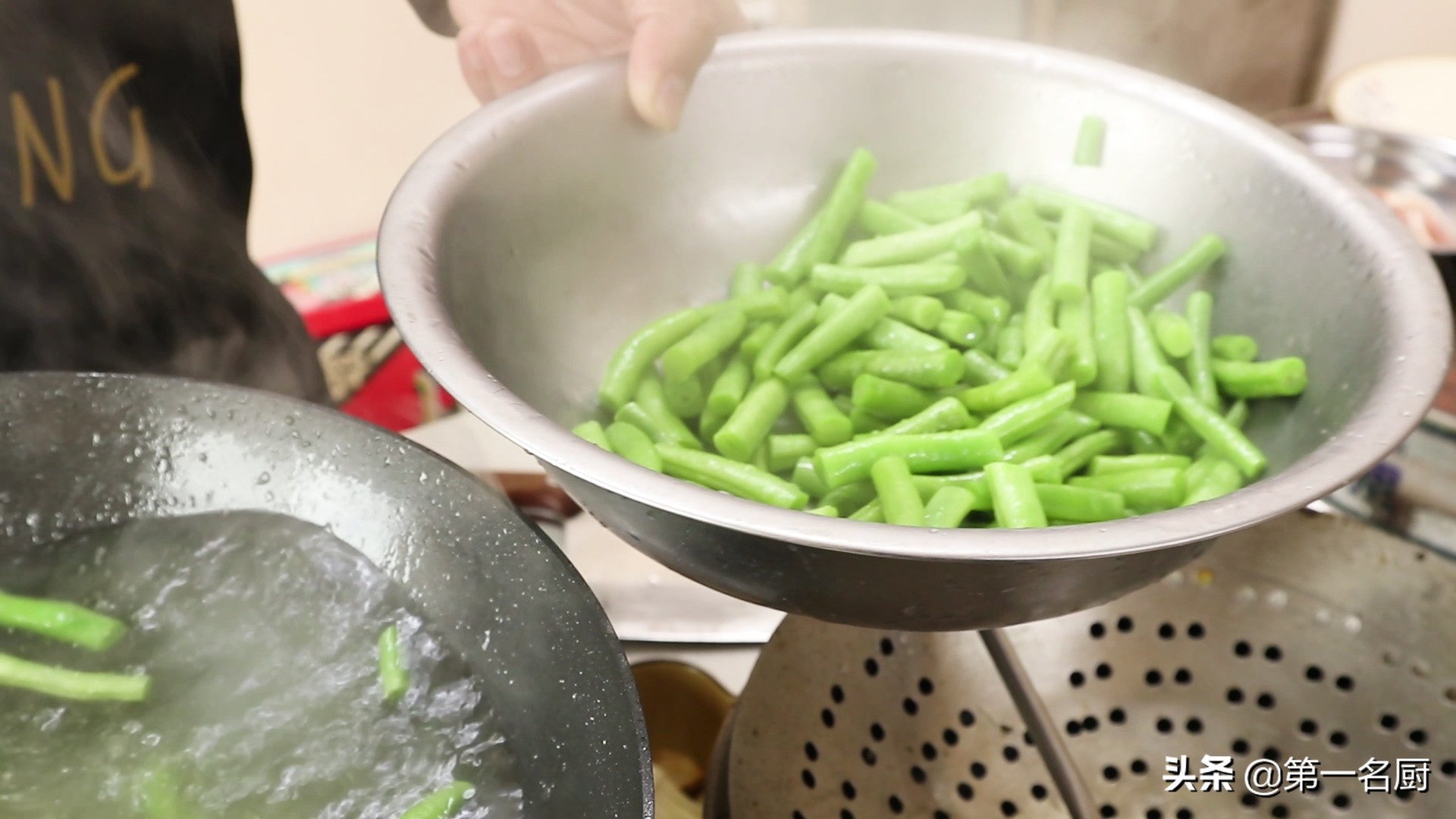 9.把四季豆煮熟,两分钟以后捞出控水,放入盆中。