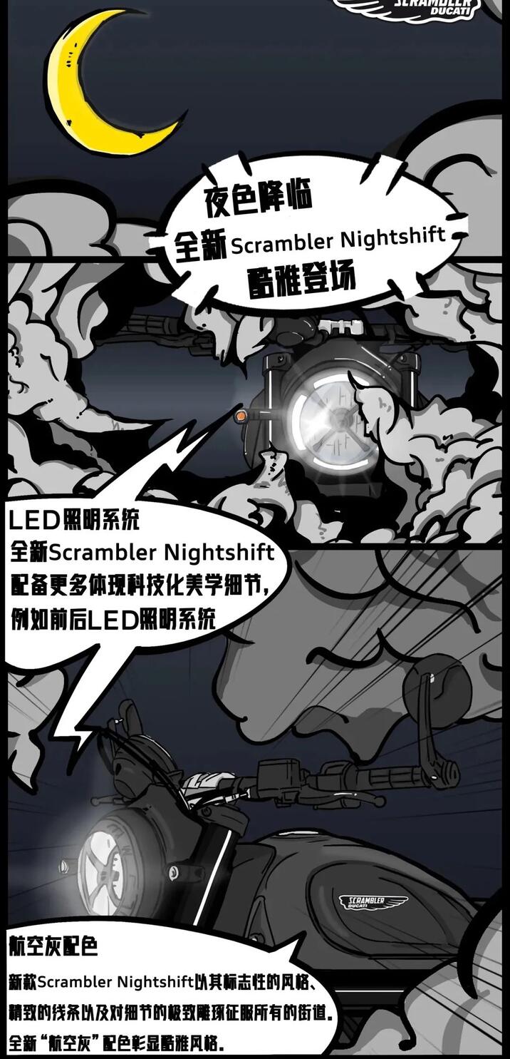 杜卡迪中国以漫画的形式正式宣布Scrambler nightshift在国内上市,并且定价110000元。早在去年底杜卡迪推出了这款自游系列的新成员,取代了cafe racer和full throttle,并且在外形上结合了两个车型的设计特点,在展现复古风格的同时兼顾了舒适性。