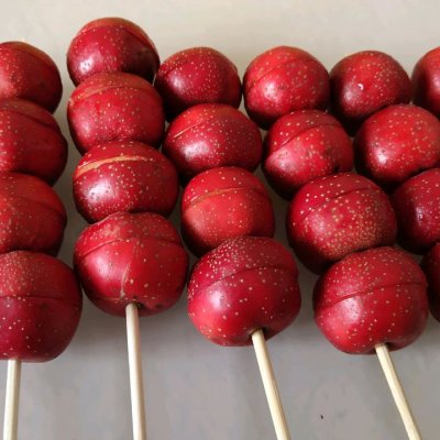 5、剔去核的山楂穿成串,注意不管要穿几个山楂,前几个都可以正着穿,最后一个要倒着穿,因为山楂去过核的山楂,尾部空隙大,容易滑落,倒着串可以防止山楂滑落。