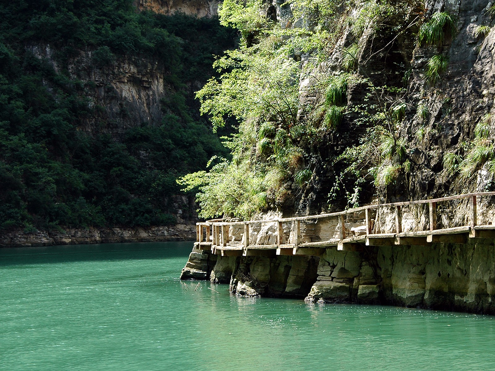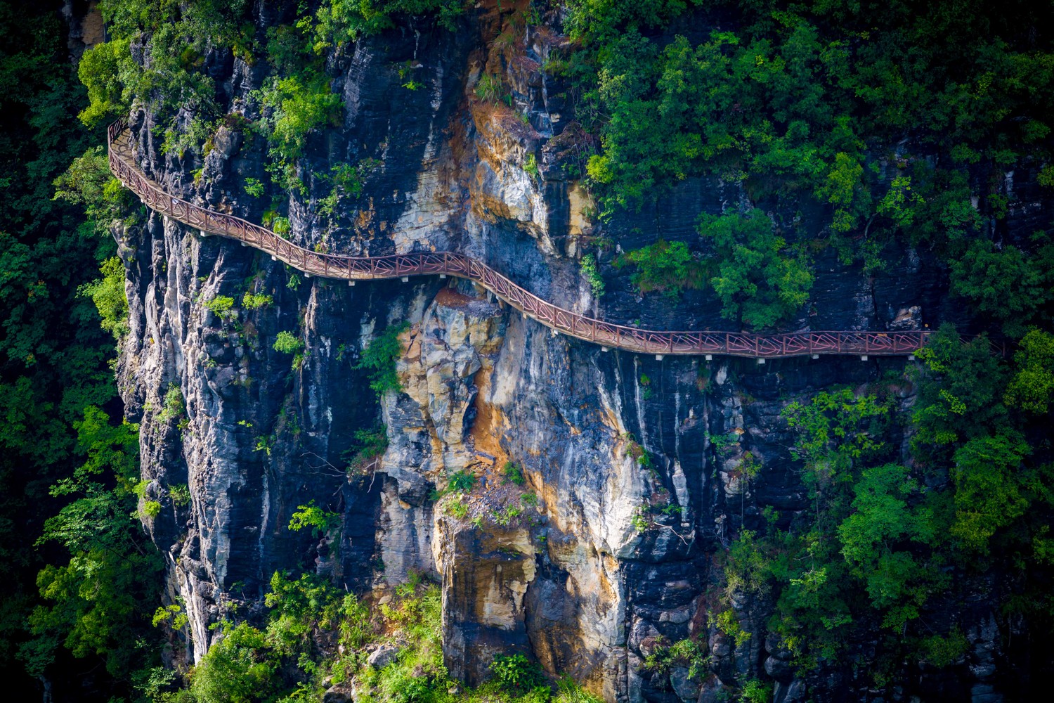 恩施地心谷的栈道建在绝壁之上,沿着栈道一路会欣赏到绝美的峡谷风光。
