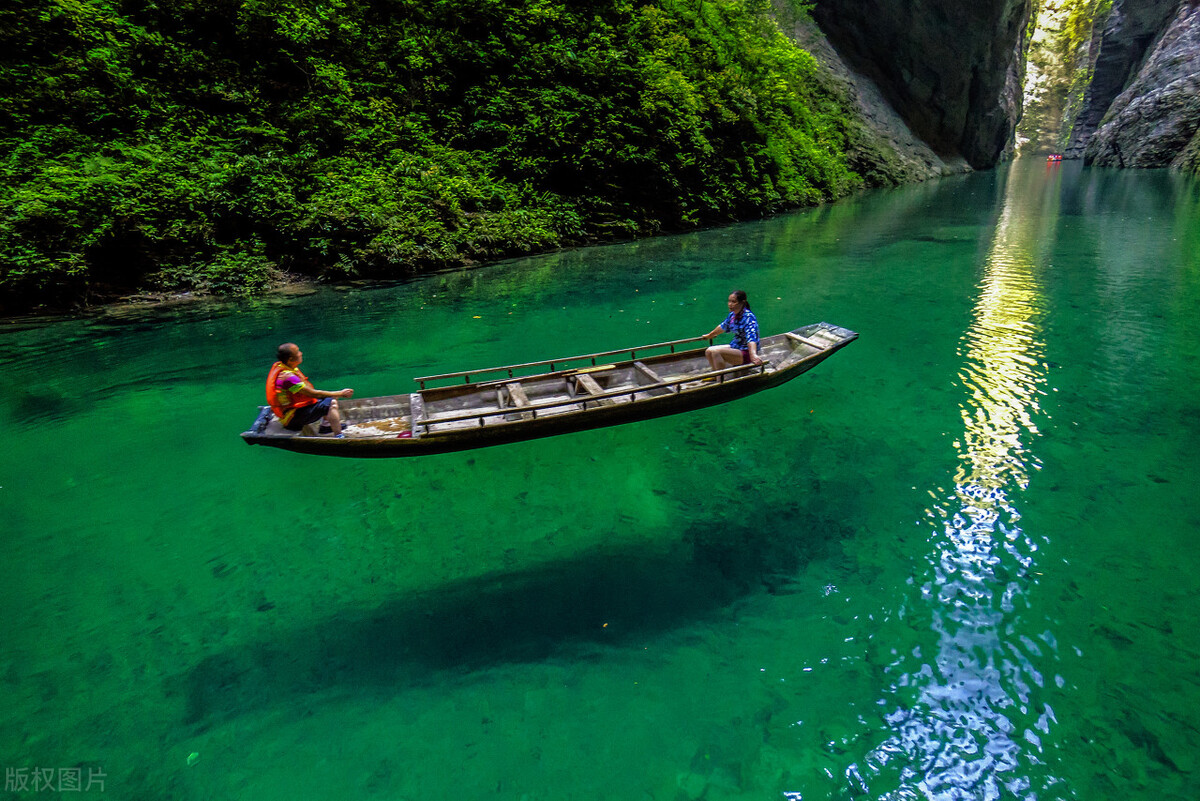 这里的水上风光最为旖旎独特,地缝里的河水清澈见底,一叶小舟仿佛悬浮在空中一般,其景色美妙绝伦,犹如马来西亚的仙本那,因而这里被游客称为中国的“仙本那”,小船则被称为“太空船”,给人一种“舟行碧波上,人在画中游”之美感,令人心旷神怡。