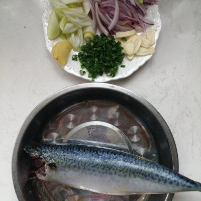 1、准备主要食材 洋葱切丝 大葱滚刀切 葱切葱花 姜片 大蒜切片 青占鱼处理备用 (平底锅不够大,我把鱼头处理掉了)