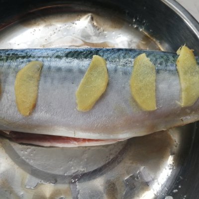3、青占鱼处理干净滤干水后,撒盐巴,倒料酒,抓捏均匀,铺姜片,腌制半小时(天热记得套保鲜膜放冰箱冷藏)