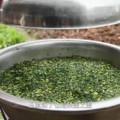 4、往菜叶里倒入烧开的淘米水(发酵作用),然后压紧实,捂一个晚上