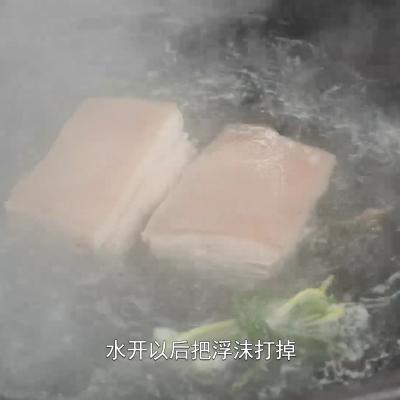 8、五花肉冷水下锅,加姜片、葱结,水开以后撇掉浮沫,然后煮6-8分钟