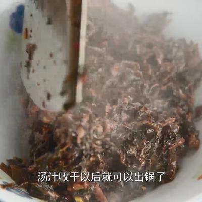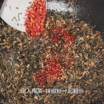 14、锅内倒油,爆香葱末,倒入梅菜和辣椒粉一起炒,然后加上焯过肉的肉汤