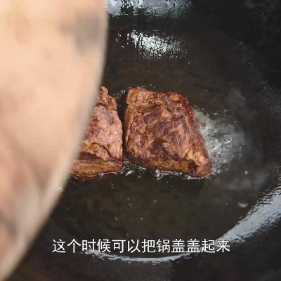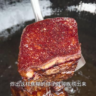 16、锅内倒油,等筷子伸进去可以看到冒泡,说明油温可以。之后放入腌制五花肉,盖上锅盖,炸3-5分钟