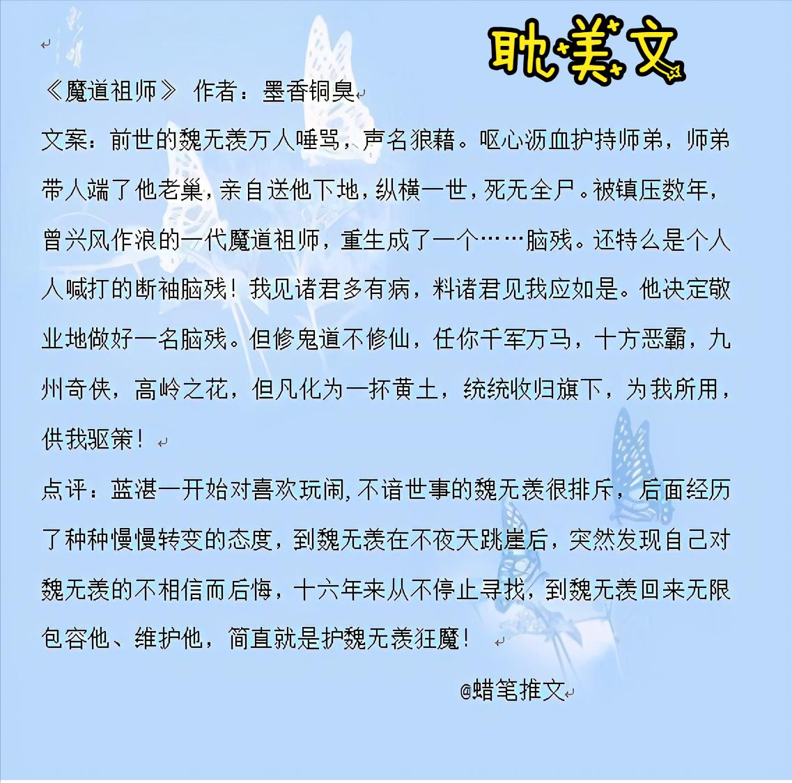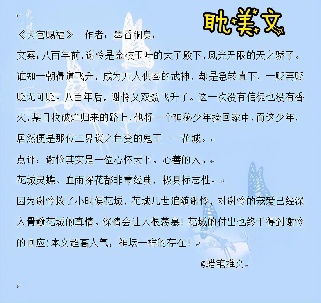 《天官赐福》:谢怜其实是一位心怀天下、心善的人,花城的灵蝶、血雨探花都非常经典,极具标志性。因为谢怜救了小时候的花城,花城几世追随谢怜,对谢怜的宠爱已经深入骨髓花城的真情、深情会让人很羡慕!花城的付出也终于得到谢怜的回应!本文超高人气,神坛一样的存在!