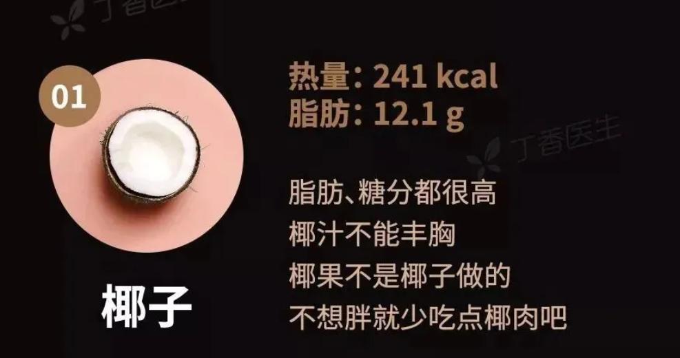 第一名:椰子,热量241kcal、脂肪12.1g,热量比肉高出将近100 kcal,脂肪也比肉高出近一半。