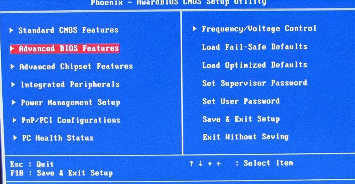 1、选择“Advanced BIOS Features”高级BIOS设置选项。