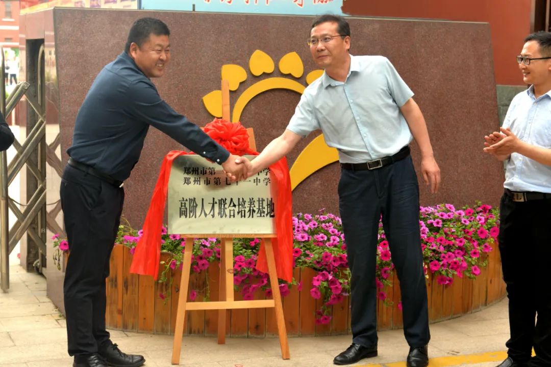 郑州市第106高级中学书记、校长李明德和郑州市第71中学校长徐建志共同揭牌