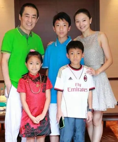 后排左起:张艺谋、张艺谋长子张壹男、张艺谋妻子陈婷。前排左起:张艺谋女儿张壹娇、张艺谋次子张壹丁。