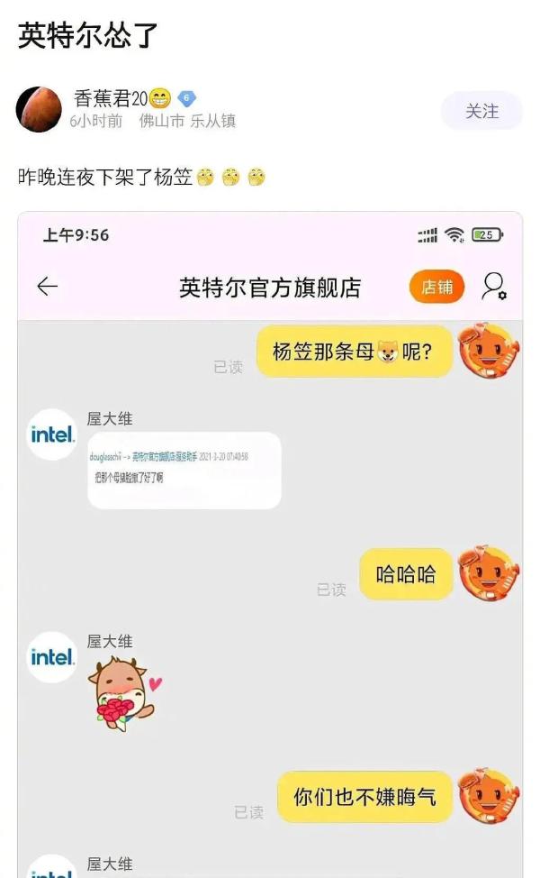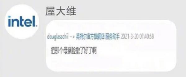 从截图可以看到,英特尔客服直接转发了称杨笠“母猪脸”的截图来回应网友的质疑。