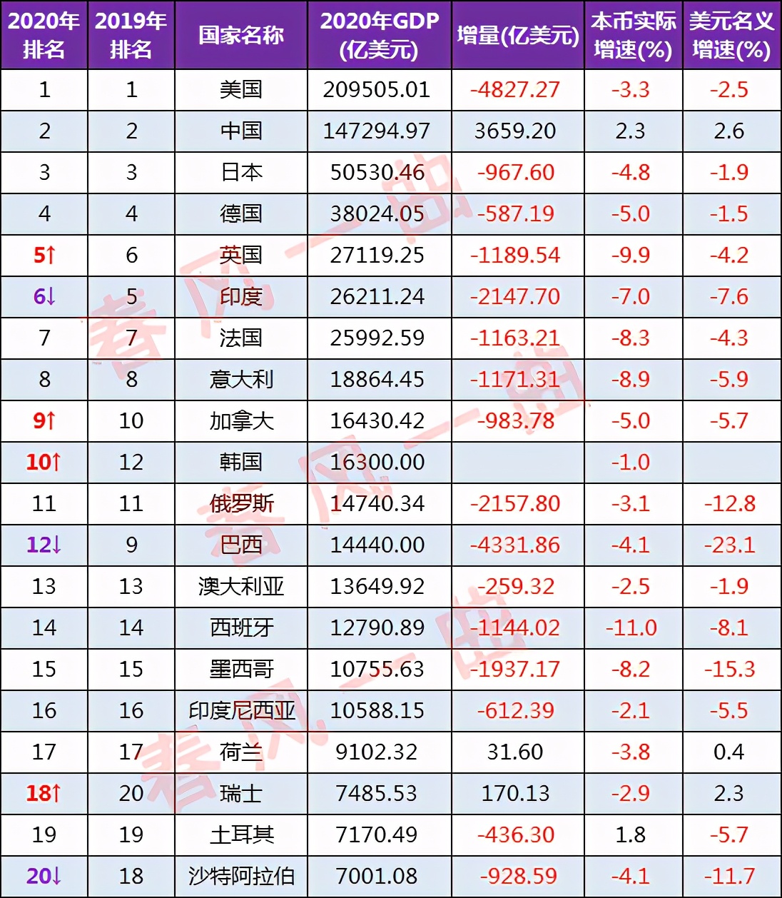 俄罗斯虽然经济增速为-12.8%,但仍然排名世界第11位,略高于大幅跌落的巴西,但被韩国反超,失去了跻身世界前十的机会;澳大利亚、西班牙、墨西哥、印度尼西亚、荷兰五个国家的排名也与2019年保持一致;受疫情影响较小的瑞士,经济增速领先诸多国家,从世界第20上升至第18,与经济增速达到-11.7%的沙特阿拉伯交换了位置。