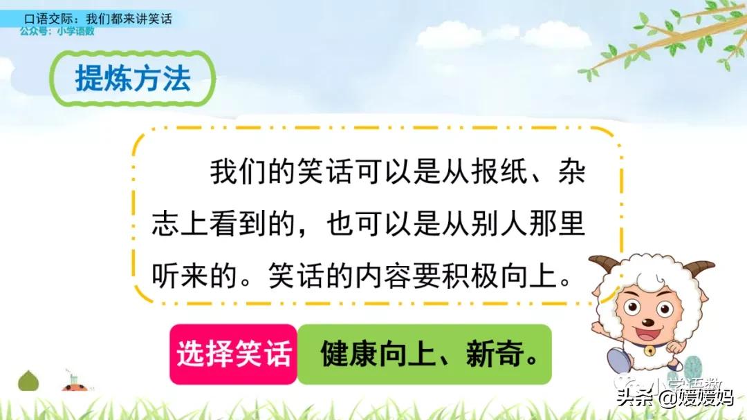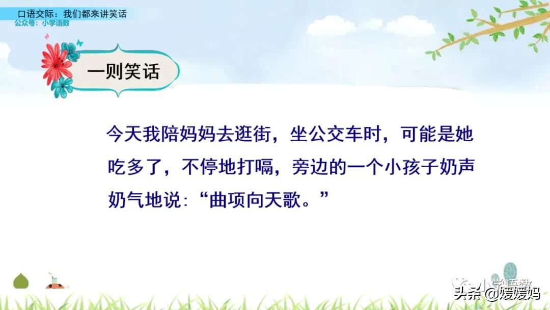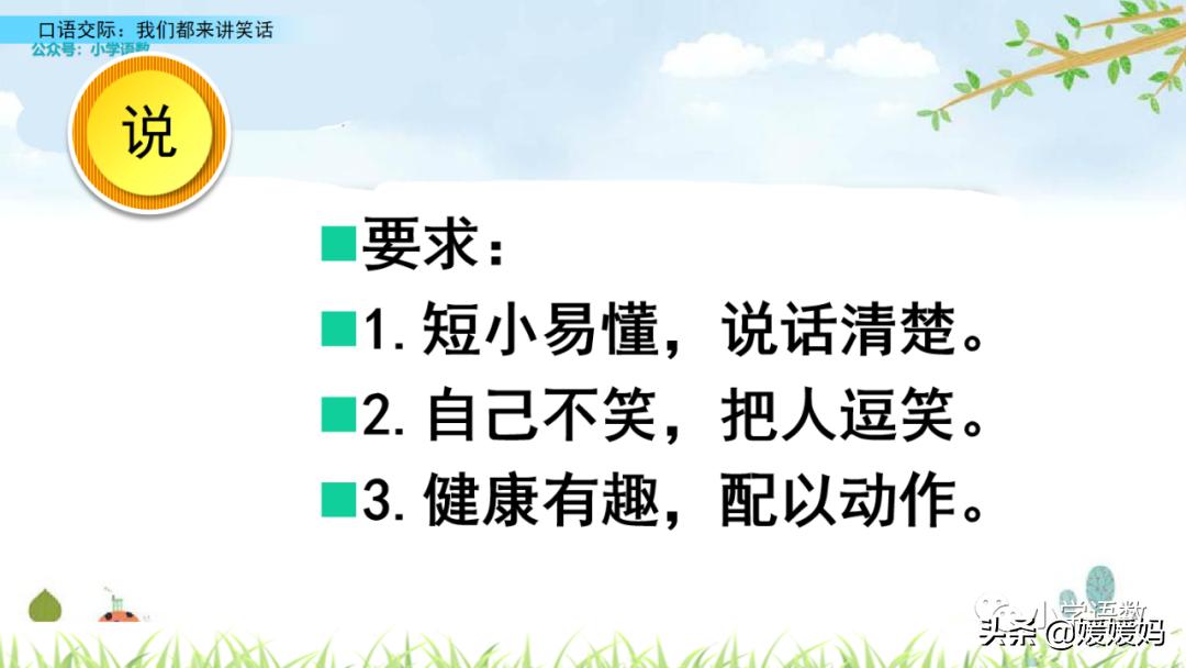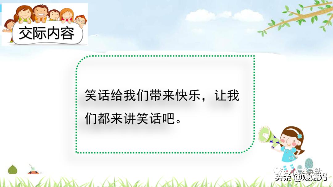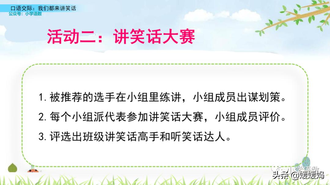 笑话能给我们带来快乐,愉悦我们的生活,这次口语交际要求我们学会讲笑话,组织一次笑话大会。