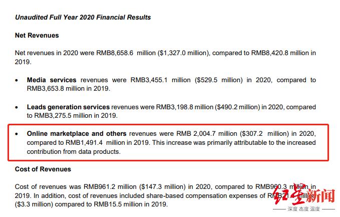 而从数据业务来看,其表现似乎比金融业务更为亮眼。根据2020第四季度财报显示,汽车之家的线上市场及其他中,其增速主要由数据业务推动。