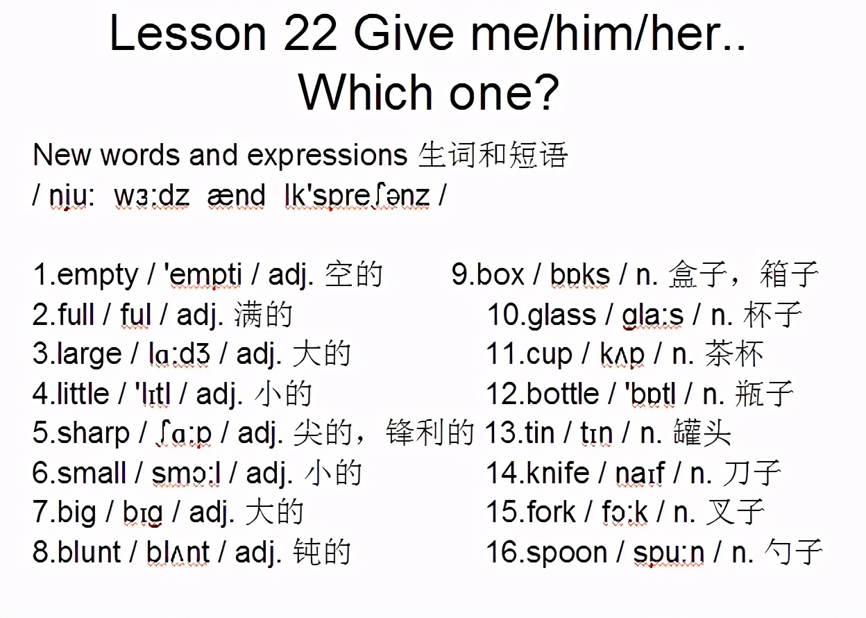 8.blunt / bl?nt / adj. 钝的 16.spoon / spu:n / n. 勺子