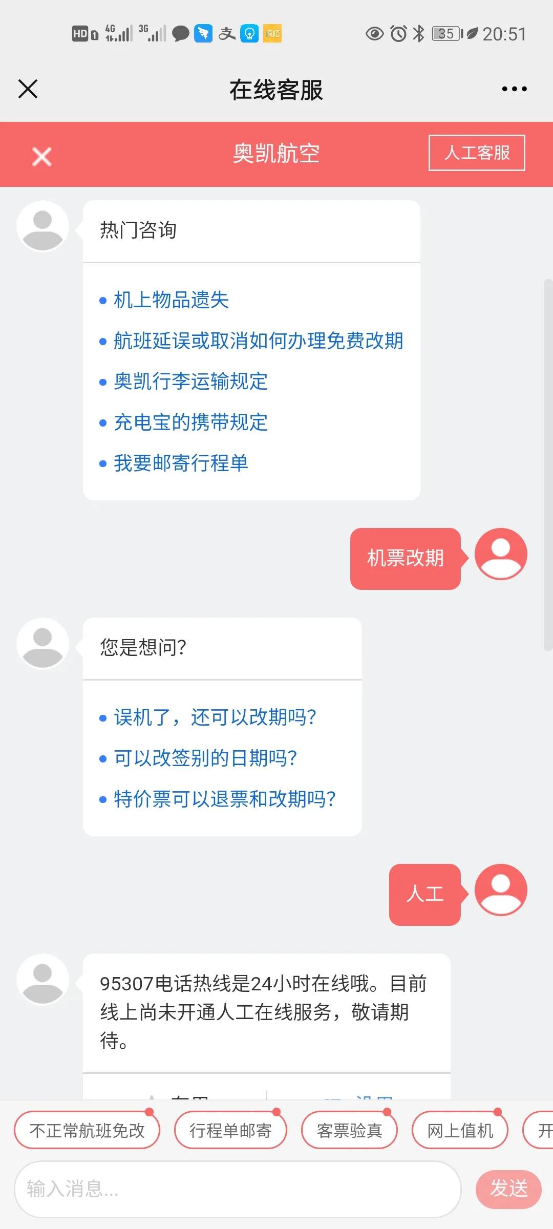 本来预订了奥凯航空的机票回天津,中间有事要联系航空公司客服,打客服电话,听到电子引到音,选择相应按键后,提示等待人数4人,继续等待,一会儿又提示,是否选择继续等待,按0继续等待,过一会儿,又提示,等待2人,过一会儿再提示,客服忙,强制挂断。