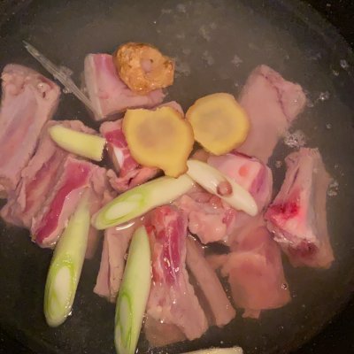 2、精排冷水下锅加葱段、姜片、料酒焯水煮开,撇去浮末捞出;