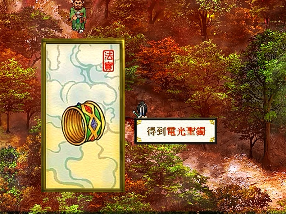 第五件法宝。在黑山镇外的树林里,剧情是进树林救小孩。在一棵树叶是红色的树下调查可以获得,属于非常难获得的法宝。