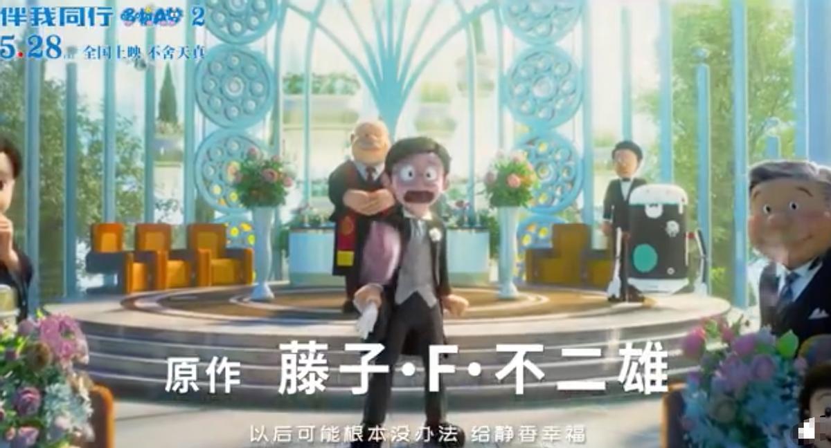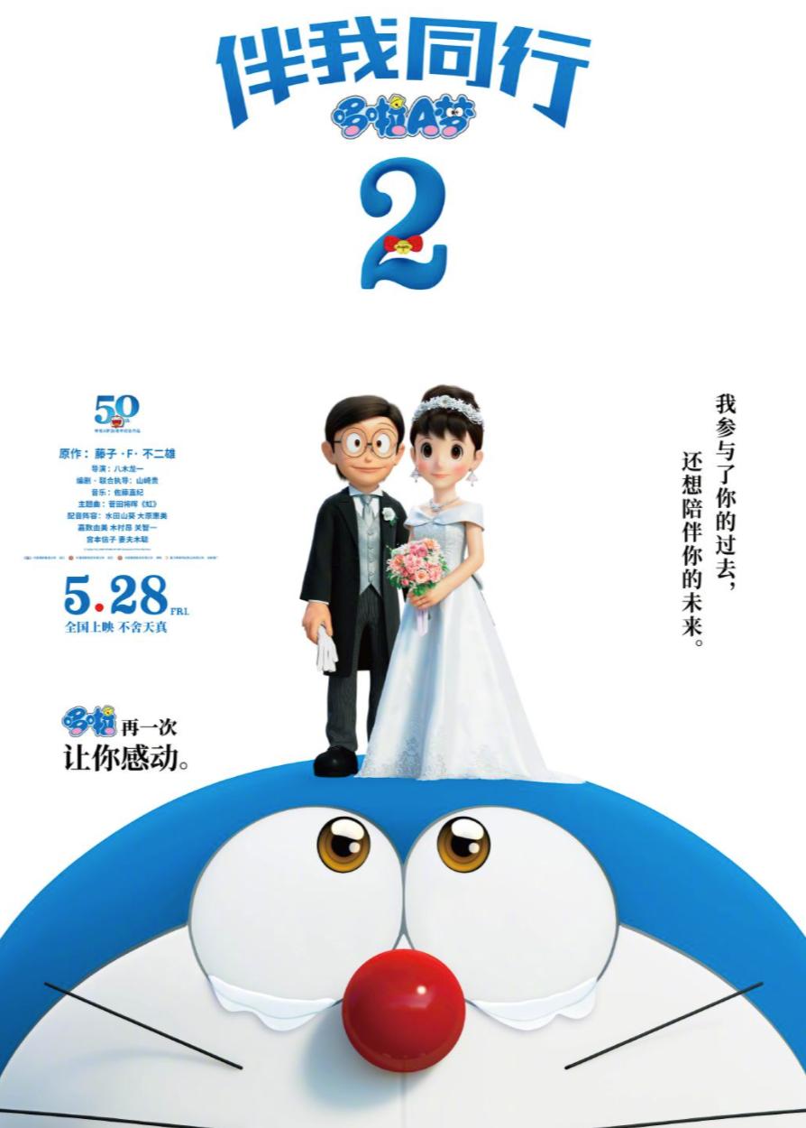 4月14日,哆啦A梦50周年的纪念电影《哆啦A梦:伴我同行2》发布了定档海报,宣布于5月28日在中国内地上映。哆啦A梦眼含热泪地看着头顶上穿着婚服的大雄和静香,画面温馨感动,旁边的宣传标语“我参与了你的过去,还想陪伴你的未来”,更是相当催泪。