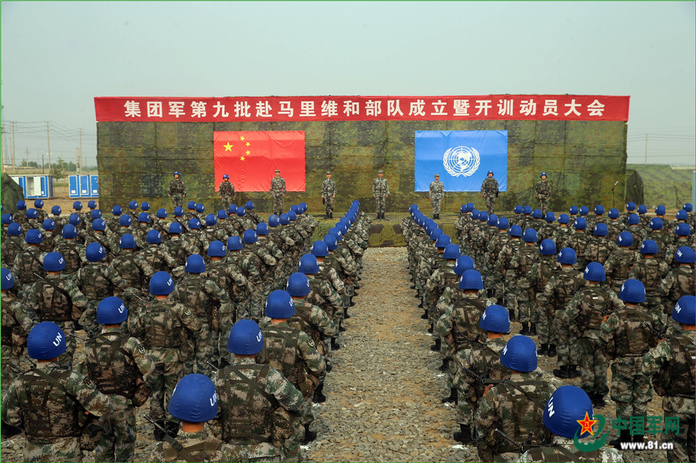 5月13日,中国第九批赴马里维和部队组建并开训。陆军第80集团军某合成旅和某工化旅等单位抽组的300余名官兵精神抖擞、士气高昂。组建暨开训动员会结束,官兵们立即转入警戒防卫、应急处突、战场救护等内容的临战训练。