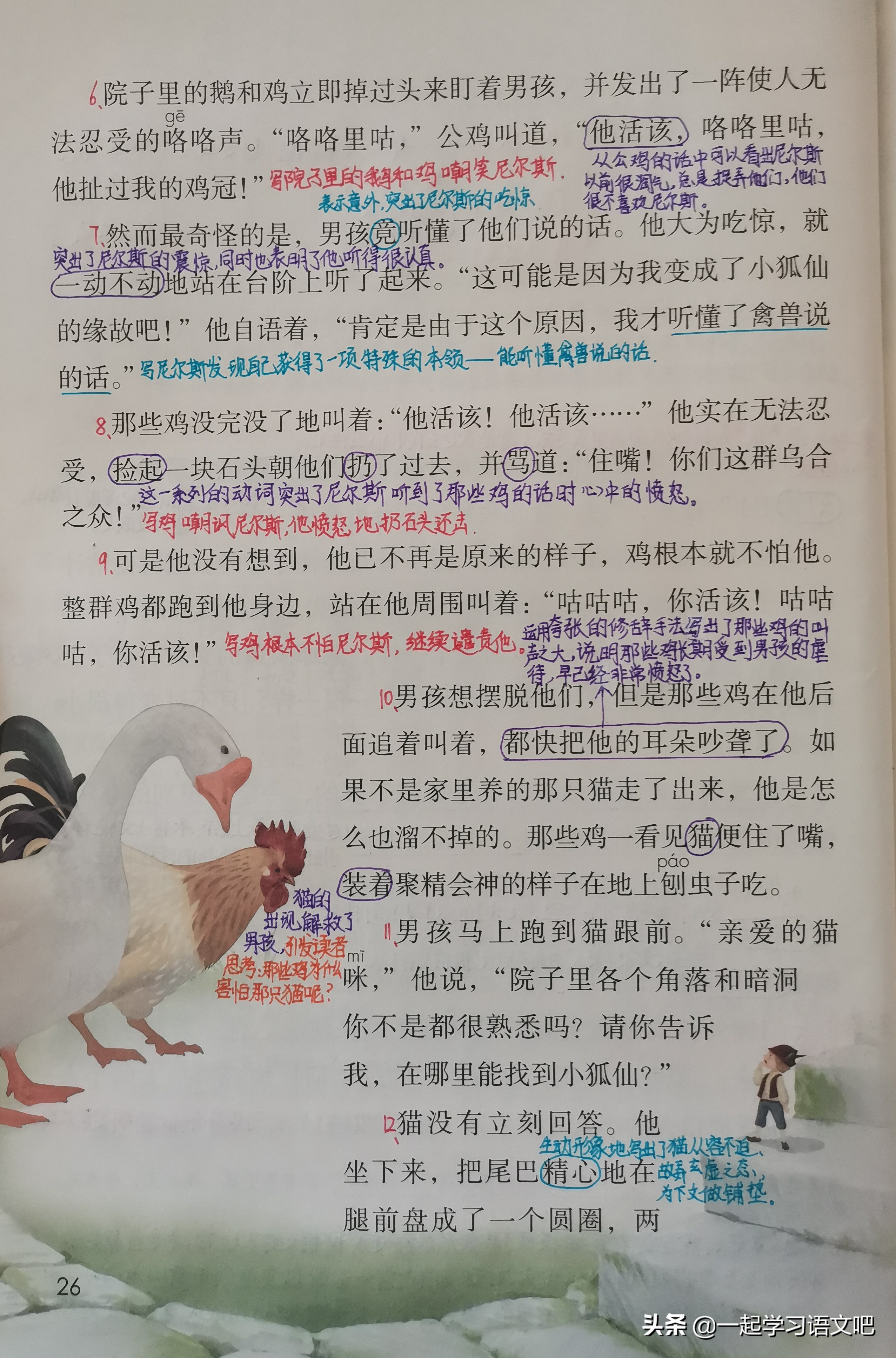 (4)第8自然段:写那些鸡嘲讽尼尔斯,他愤怒地扔石头还击。