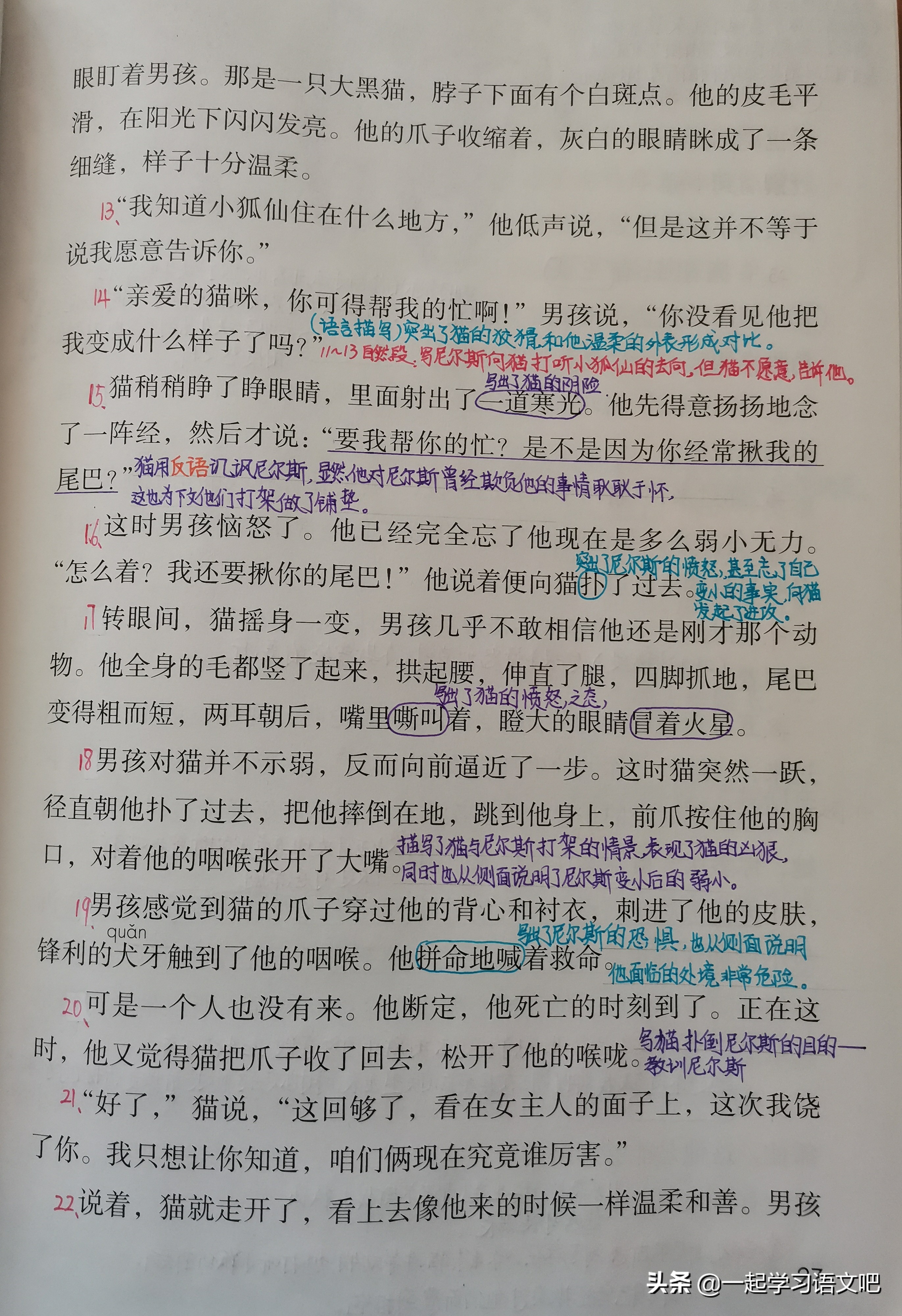 (11)第18自然段:描写了猫与尼尔斯打架的情景,表现了猫的凶狠,同时也从侧面说明了尼尔斯变小后的弱小。