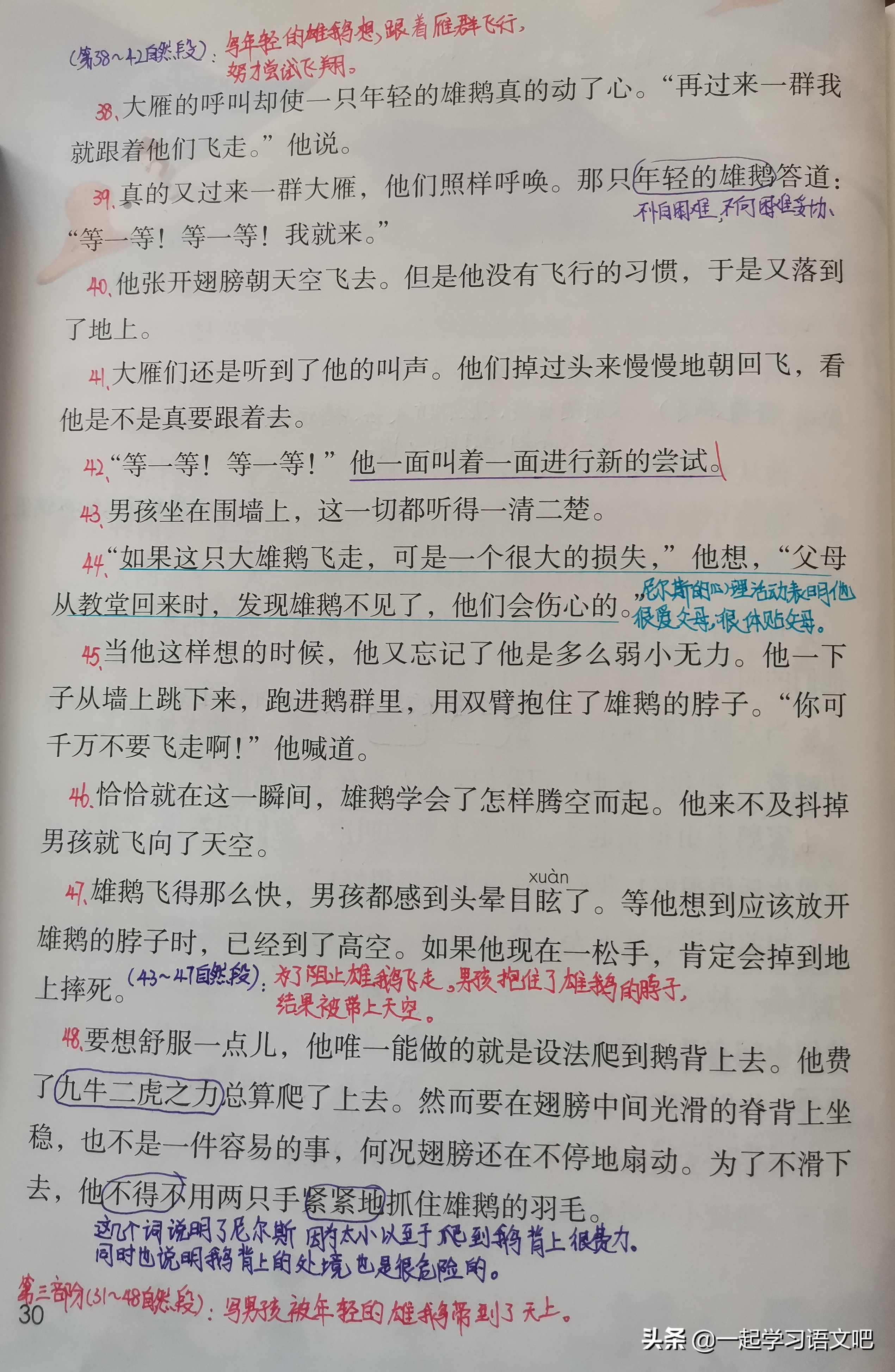 (7)第48自然段:写男孩坐在雄鹅的背上,双手紧紧抓住雄鹅的羽毛。