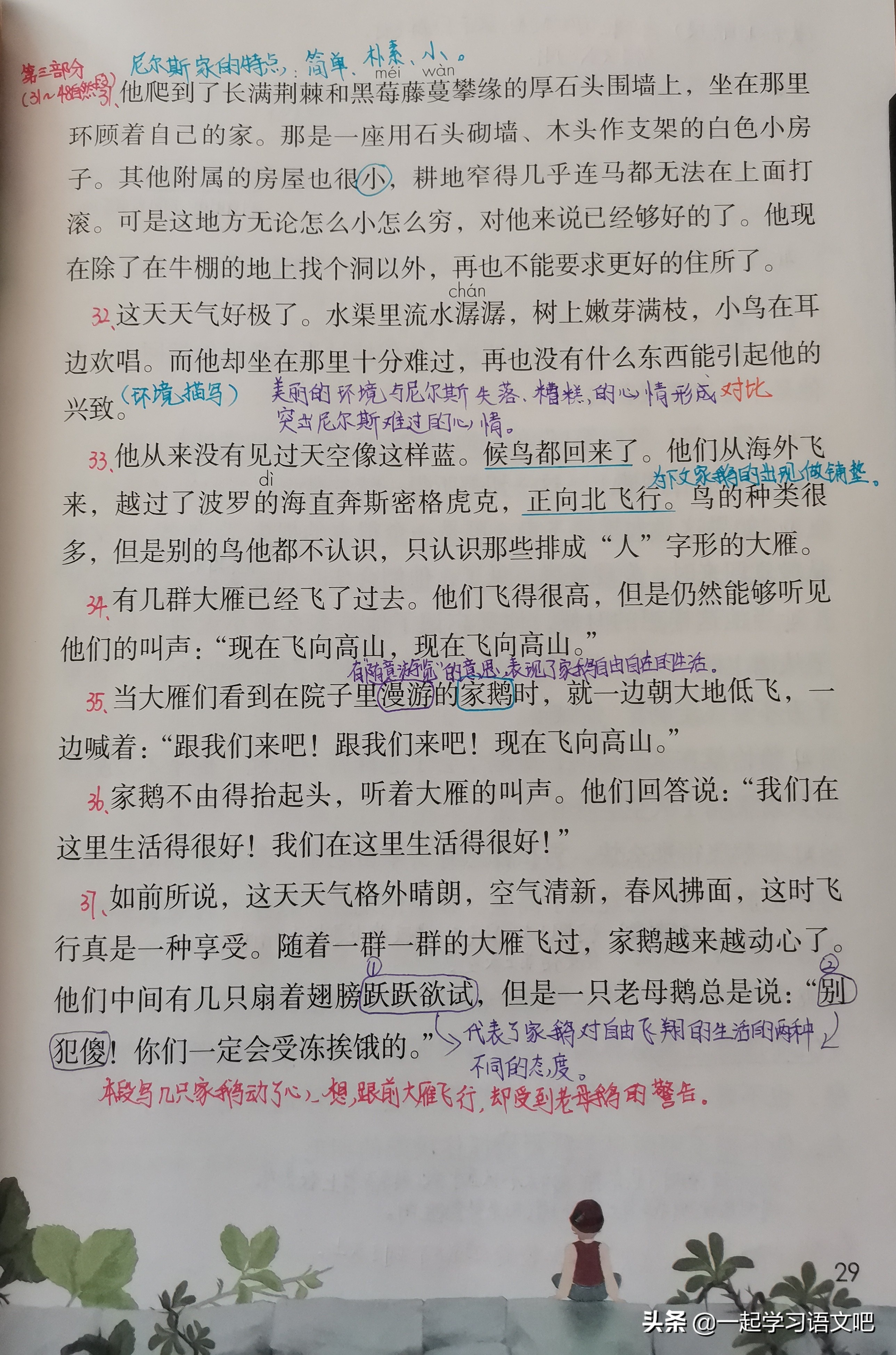 第32自然段:美丽的环境与尼尔斯失落、糟糕的心情形成对比,突出尼尔斯难过的心情。