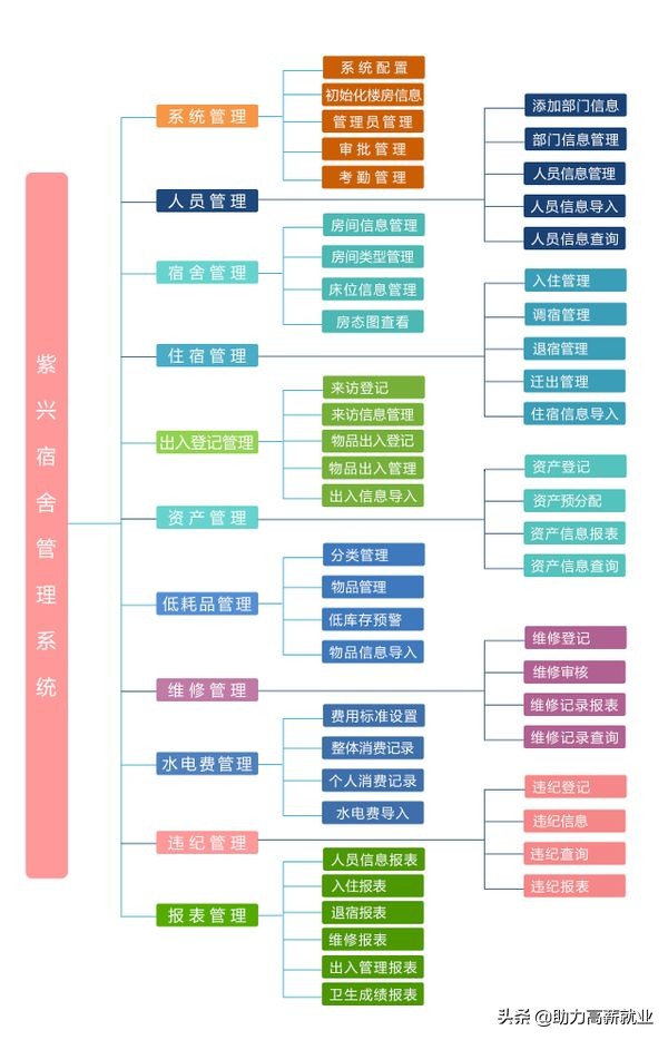 紫兴宿舍管理系统功能总共分十六大块分别是:系统管理、宿舍管理、人员管理、预分配入住管理、临时入住管理、正式入住管理、水电费管理、资产管理、低耗品管理、卫生管理、PAD查房管理、违纪管理、维修管理、出入管理、报表管理和数据库管理。