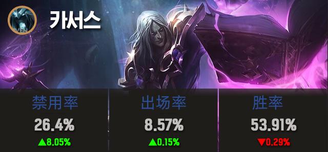 在11.4版本中,另一个热门下路英雄也遭到削弱,但卡莎的这个削弱不痛不痒,她依然保持了自己作为T1下路英雄的地位,出场率、禁用率和胜率都很高。而另一些下路英雄,如金克丝和凯特琳则是有复苏的迹象,在过去一周的选用率和胜率有所提升。值得一提的是,萨勒芬妮下路越来越火了,带来了新的法核下路玩法。萨勒芬妮下路的胜率非常高,尤其是搭配赛娜时,在某些比赛中也偶有出场。